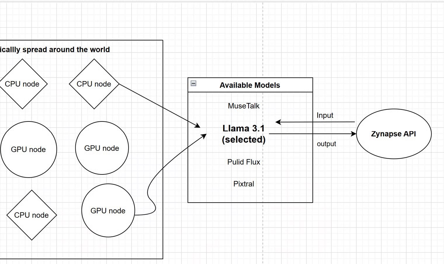 Models are sharded and stored across distributed nodes, resource manager within the Model hosting space picks the best nodes to process workload and return an output. Requests to the model hosting space are initiated through the Zynapse API