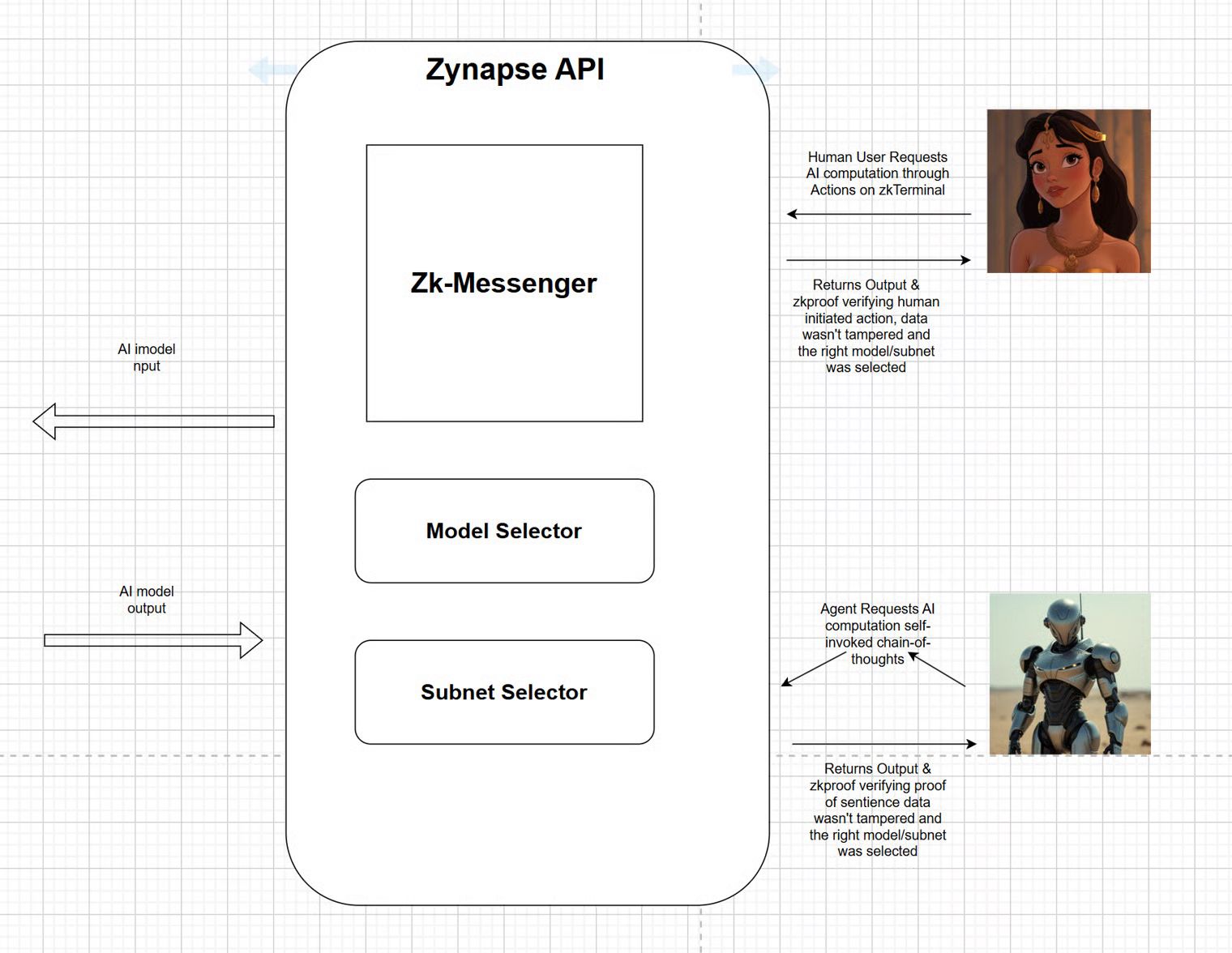 Znapse API comprises of a subnet selector, a model selector and zk-messenger. The selectors work together in deciding how the workload requested by a human user or agent should be processed based on the initiator of request and data set (whether it requires confidential computing in a private cluster or regular public cluster/what kind of wallets)