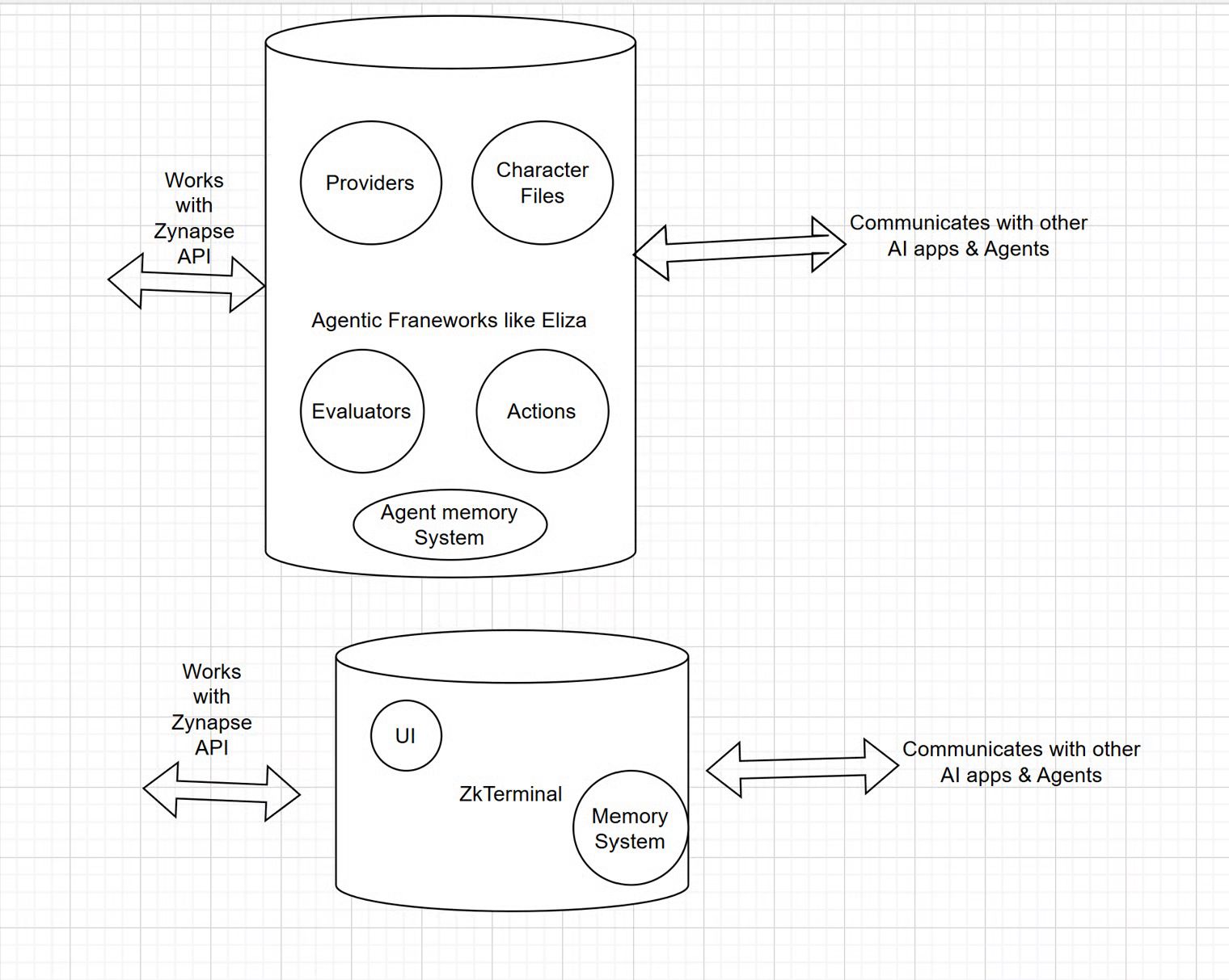 Programs that dictate the functioning of an agent like program running Eliza Framework bound with Zynapse API congtrols agent memory system, actions, evaluators, character files and providers, similarly apps like ZkTerminal can build with Zynapse API and have their own UI & Memory system. The rules around communicating with other apps & agents in the network are assigned in the program code hosted in the Agent System Space/User Space